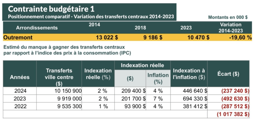 Outremont, le 22 septembre 2025 – Depuis onze ans, les transferts financiers de la ville-centre ont baissé de près de 20%, ce qui représente une RÉDUCTION de plus d’un million $ au cours des seules trois dernières année, selon les données-mêmes de l’arrondissement d’Outremont. Le portrait est encore plus sombre compte tenu du fait que l’augmentation de 13% du territoire des-servi à la suite de l’intégration du campus MIL n’a donné lieu à aucun ajout de ressources financières.